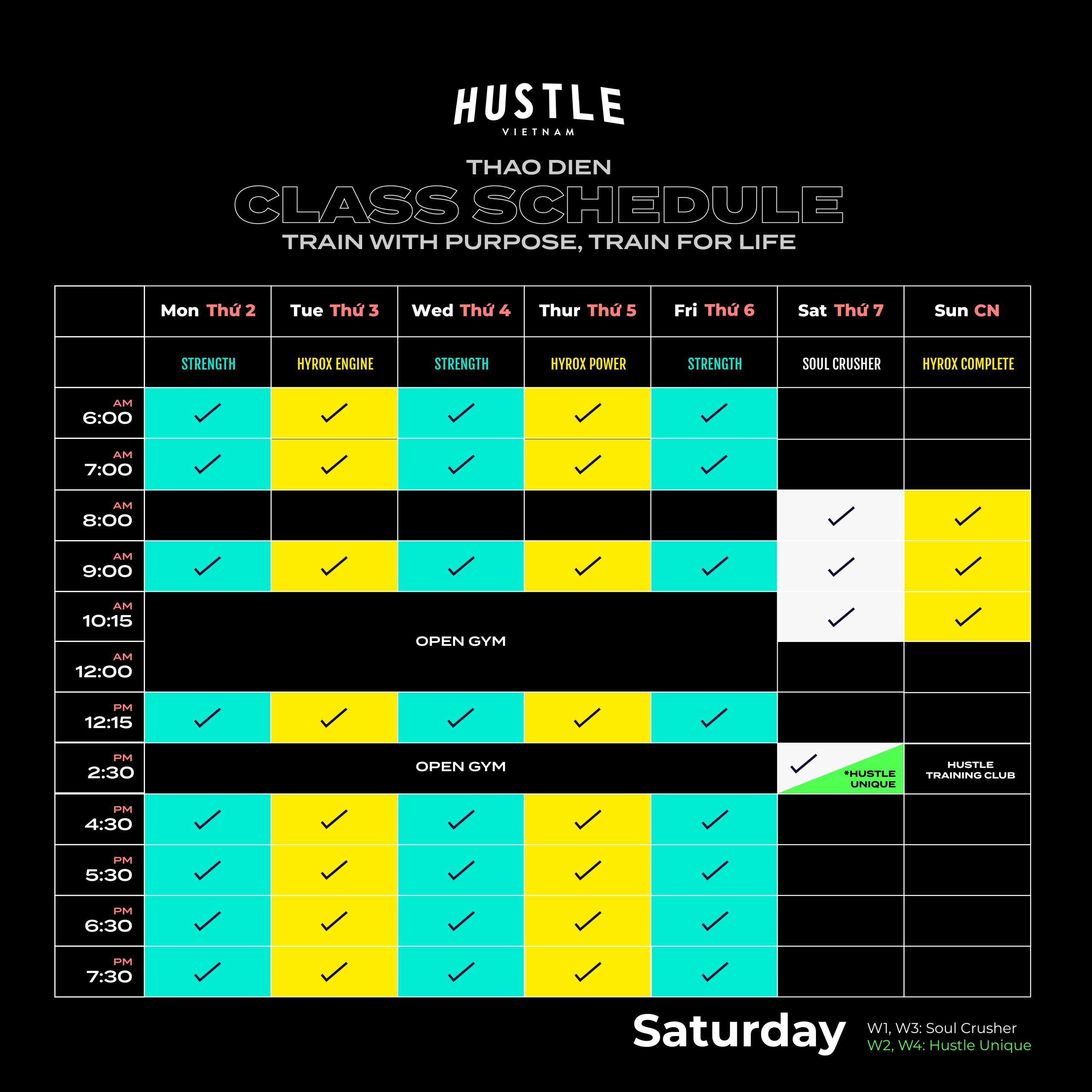A high intensity training class designed to challenge both physical capacity and mental resilience. Soul Crusher focuses on high workload, continuous pacing, and full body movements to deliver a demanding, high energy workout that pushes limits and embodies the true Hustle spirit.